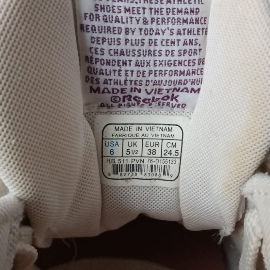 Détails : Logo Reebok brodé sur le talon et étiquette tissée sur la languette avec l’emblématique Union Jack.